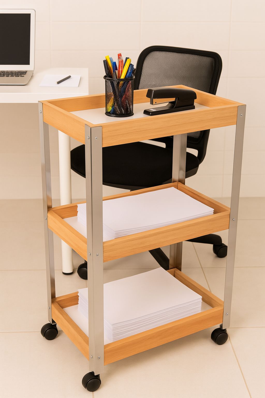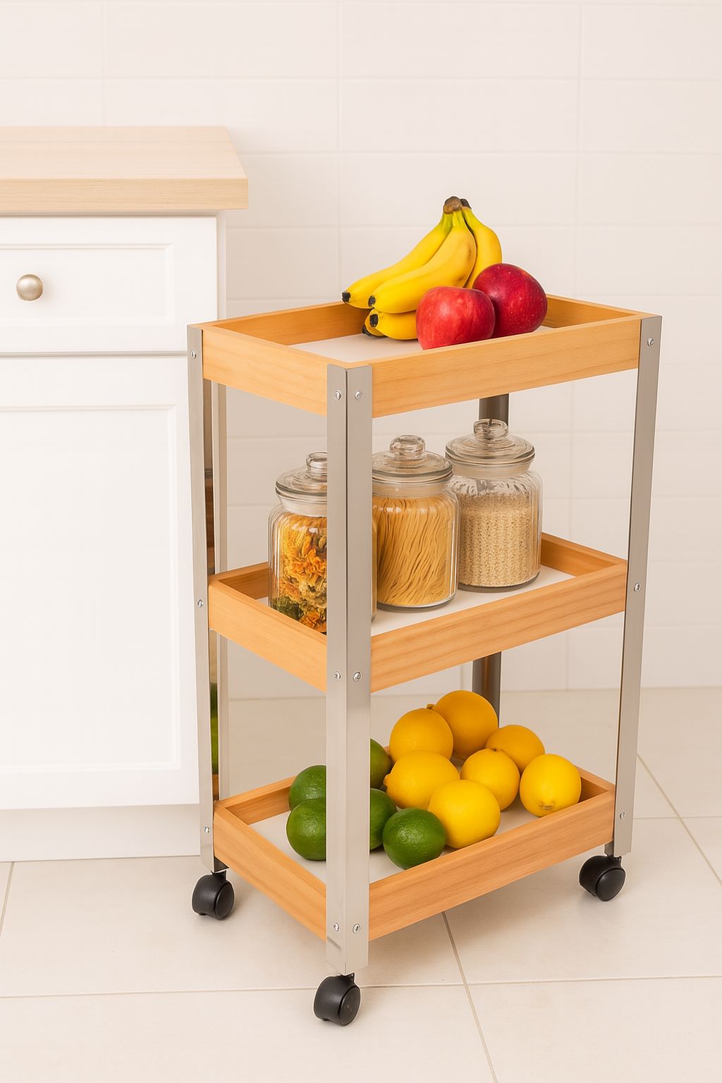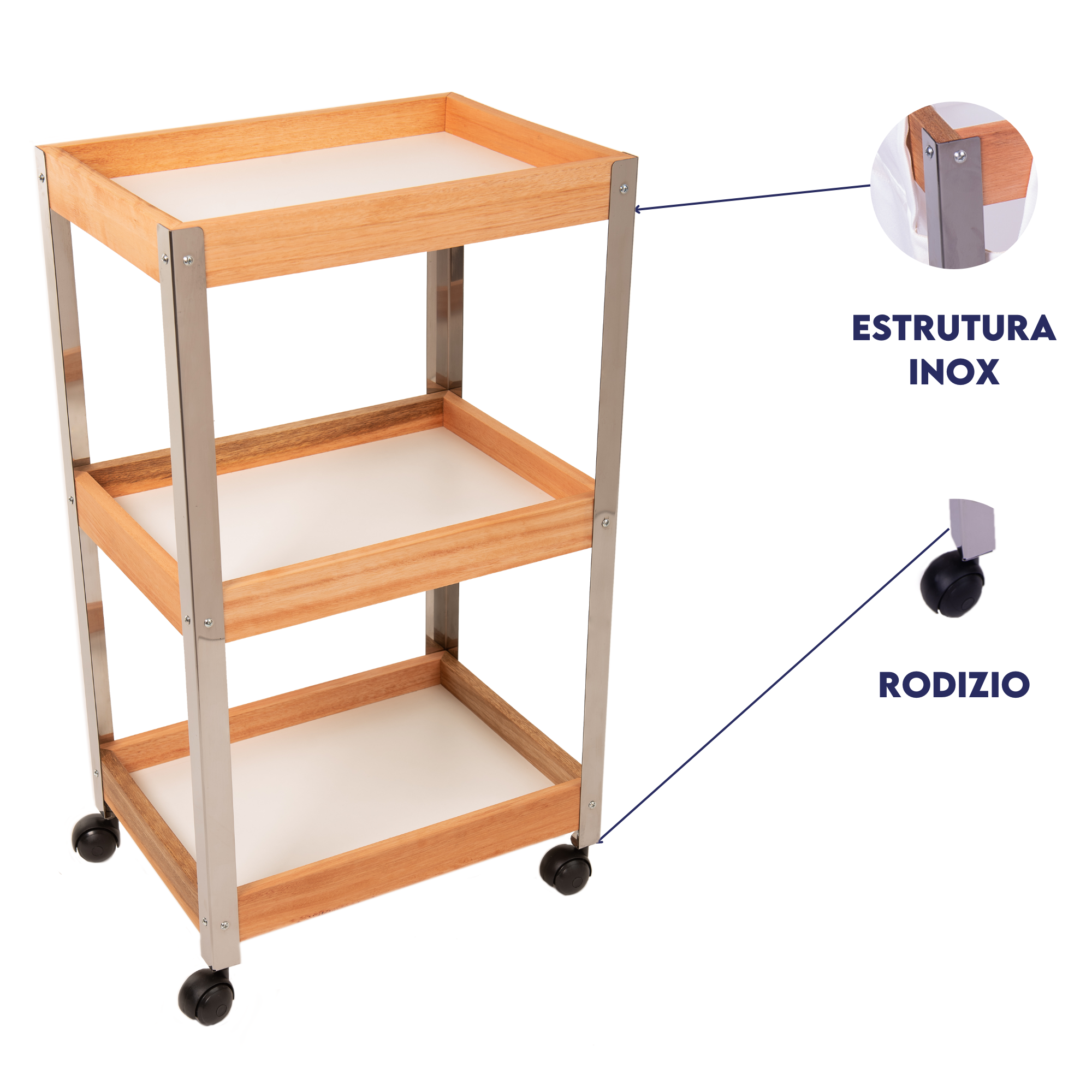 O Carrinho Organizador Essence é a escolha perfeita para quem busca uma solução de armazenamento que une a beleza da madeira ao toque moderno do inox. Adquira o seu e experimente a conveniência e o estilo que ele oferece!