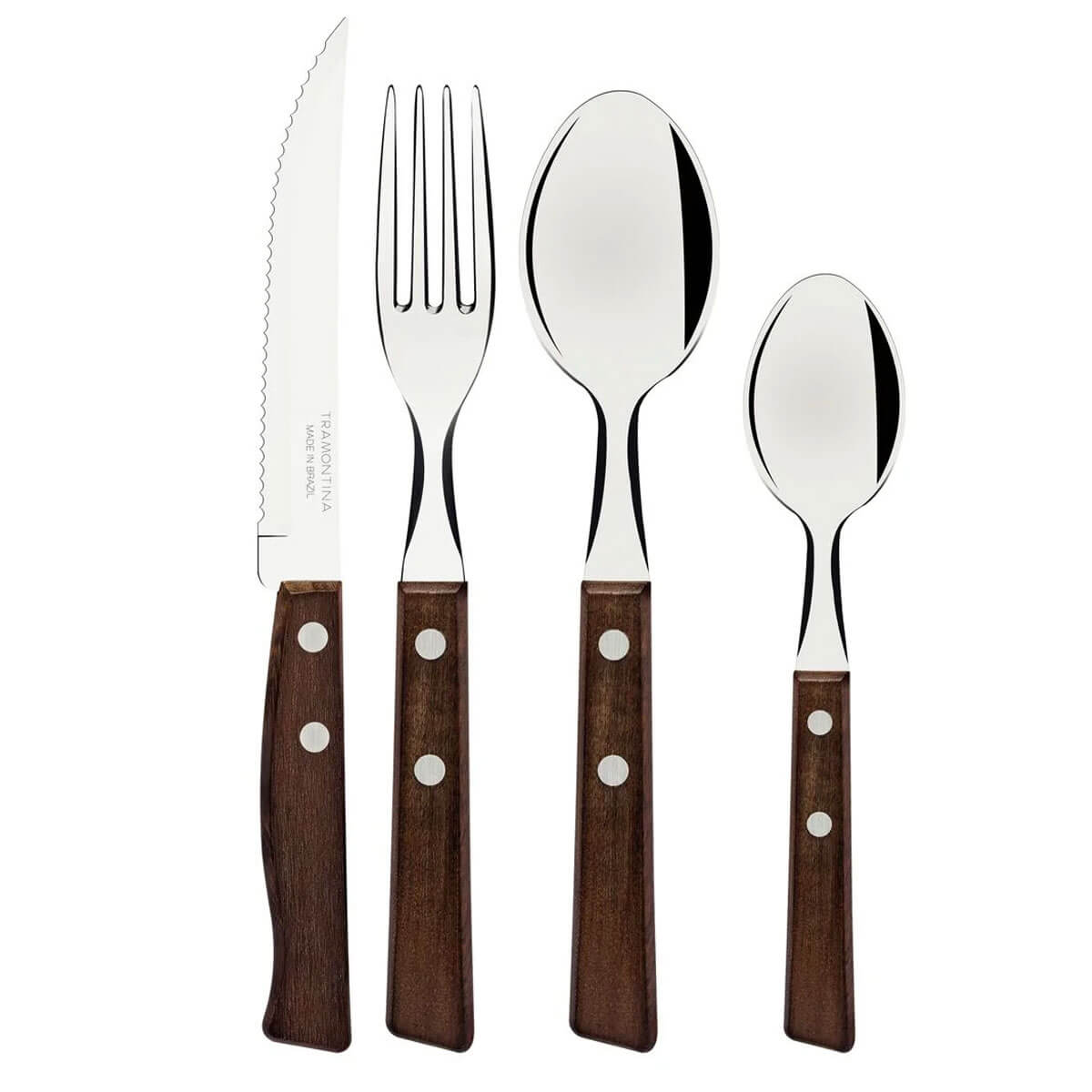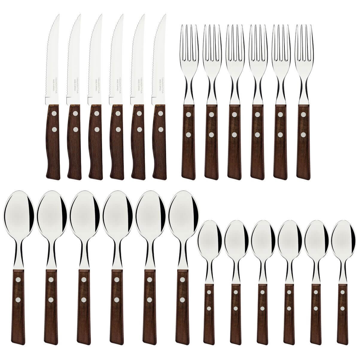 Conteúdo: 6 garfos de mesa, 6 colheres de mesa, 6 facas de mesa e 6 colheres de chá;