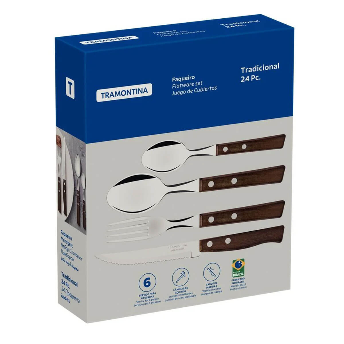 Faqueiro Tramontina Tradicional Aço Inox e Madeira Natural Garfo Faca Colher 24 Peças.