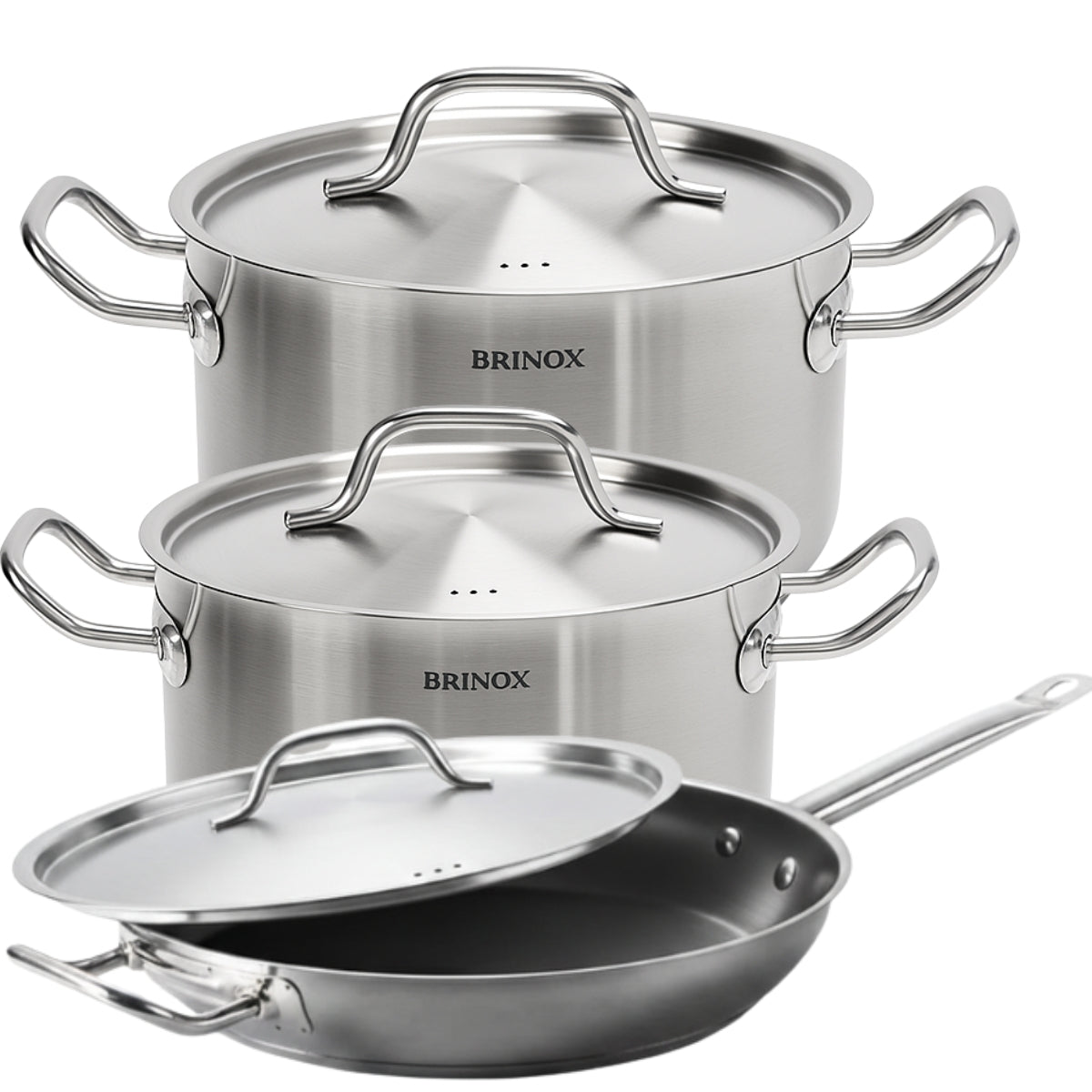 Jogo de Panelas Profissionais 3 Peças 32cm Inox Fundo Triplo Brinox Caldeirão Caçarola Frigideira.