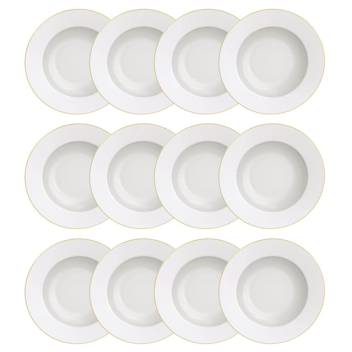 Conteúdo: 12 pratos fundos com borda dourada;