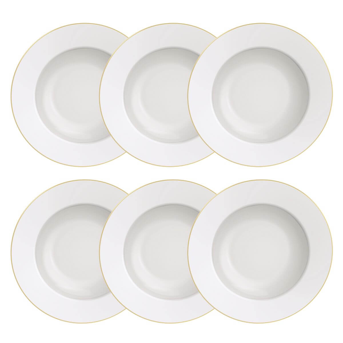 Conteúdo: 6 pratos fundos com borda dourada;