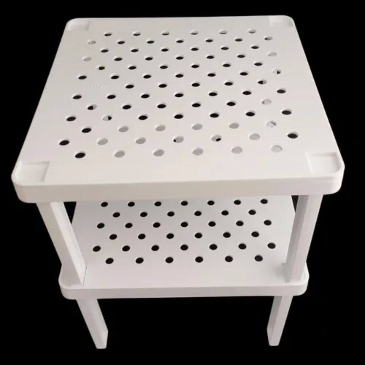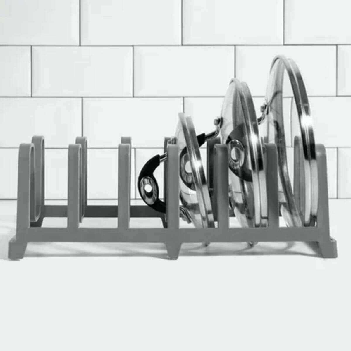 Kit Porta Tampas de Panela Chumbo e Organizador de Armários Prateleira Empilhável Branco Plástico OU.