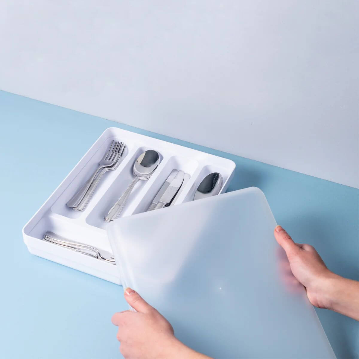 O porta talheres com tampa protege os utensílios contra poeira e facilita a separação de colheres, facas e garfos dentro da gaveta. Já o organizador de prateleira amplia o espaço interno do armário, permitindo empilhar louças, copos ou potes de forma segura e acessível. Ambos são produzidos em plástico resistente, fáceis de limpar e oferecem funcionalidade e praticidade no dia a dia.