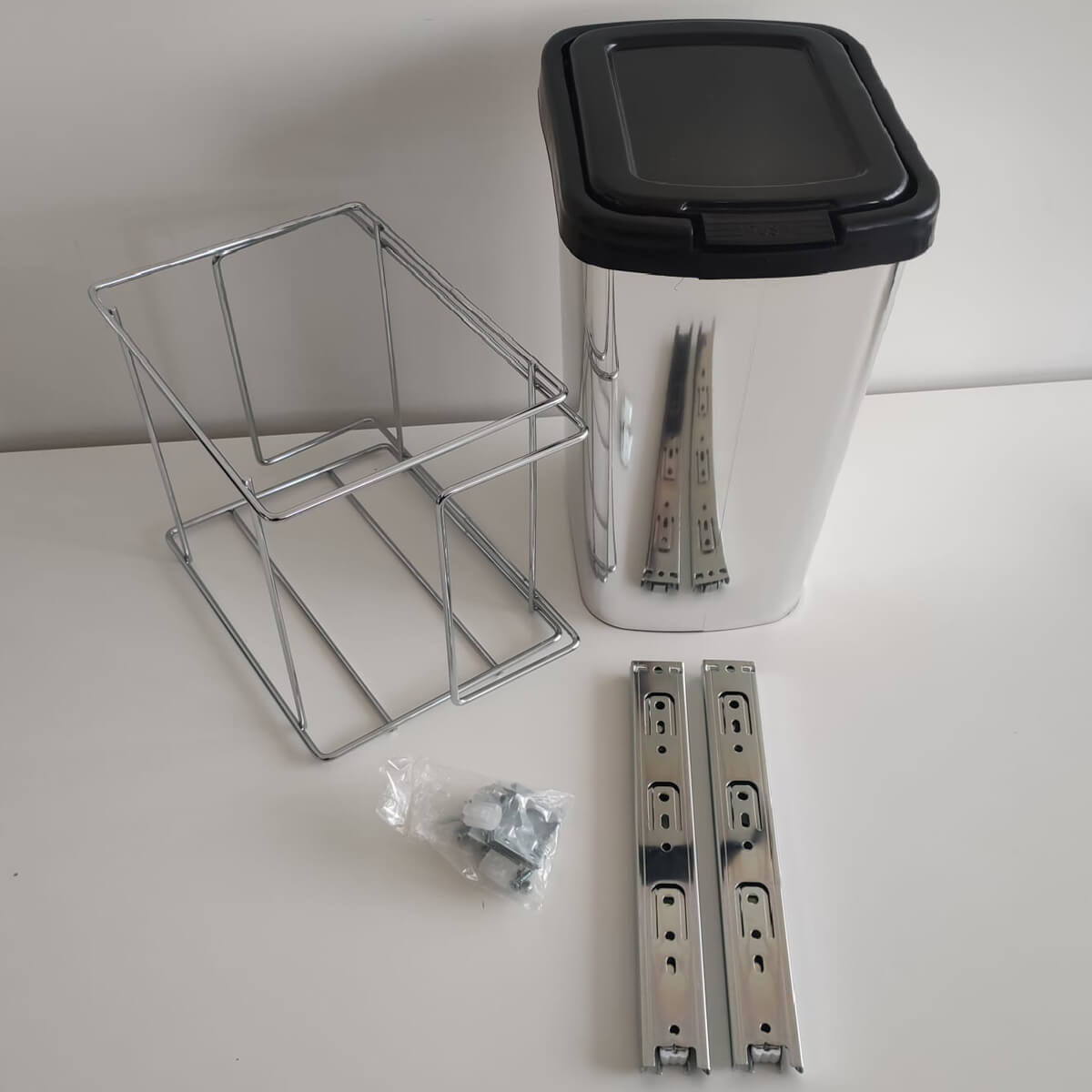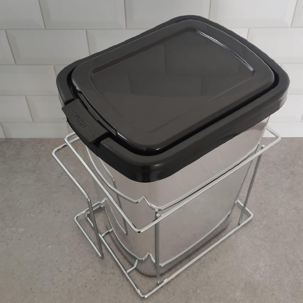 Esta lixeira de embutir / instalar em armário, com trilho deslizante da Dimec é a escolha ideal para quem deseja unir beleza e funcionalidade em sua cozinha. Ideal para instalação em nichos e armários, possui suporte aramado em aço cromado com corrediças laterais e uma lixeira de plástico cromada com tampa preta com capacidade de 9 litros. Garantindo além de resistência e durabilidade, maior facilidade na hora da higienização. Um modelo bastante completo e eficiente, que garante maior praticidade e funcionalidade.