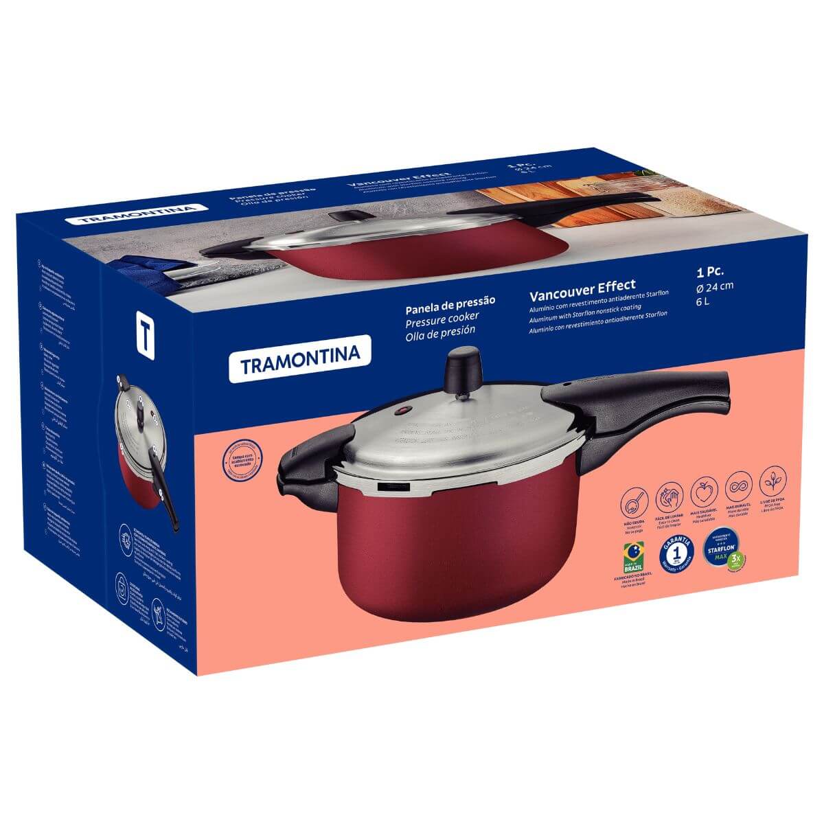 A panela de pressão Tramontina Vancouver Effect combina design moderno, desempenho e praticidade em um utensílio indispensável para cozinhas exigentes. Fabricada em alumínio de 3,2 mm de espessura, ela conduz o calor de forma rápida e uniforme, proporcionando cozimentos eficientes e saborosos. Seu revestimento antiaderente Starflon Max evita que os alimentos grudem e facilita a limpeza, garantindo maior durabilidade ao produto. A vedação segura e alças e cabos em baquelite antitérmico, que permanecem frios durante o uso, proporcionam manuseio seguro e confortável. Com diâmetro de 24 cm, a capacidade de 6 litros é ideal para preparar pratos para toda a família ou encontros com amigos, sem perder qualidade ou rapidez no cozimento.