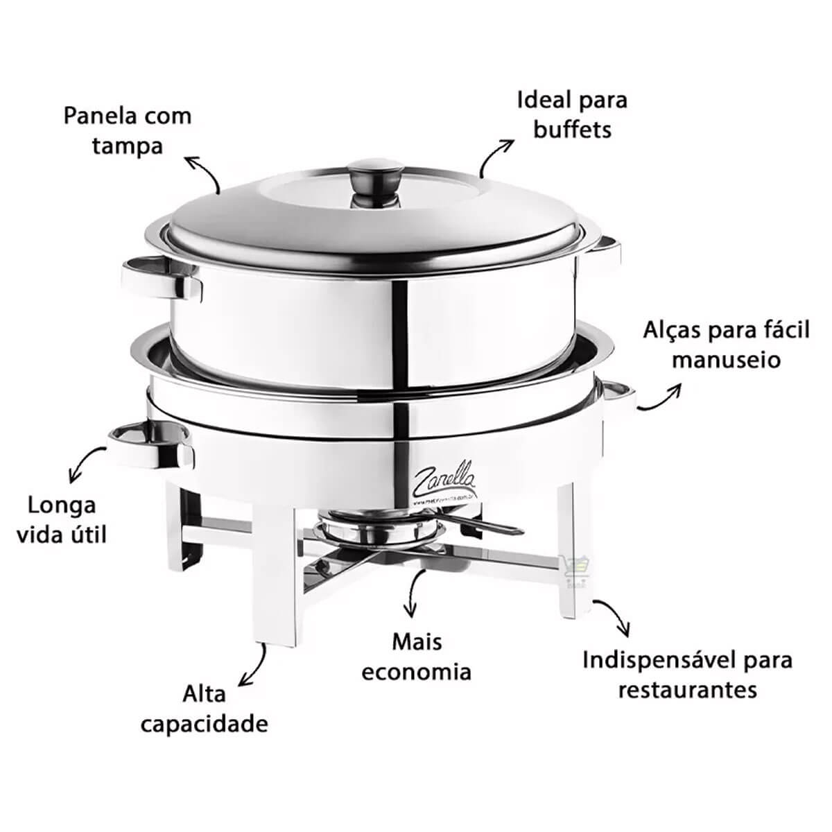 Rechaud Redondo com Banho Maria 10L Zanella Aço Inox Restaurante Hotel Buffet Eventos.