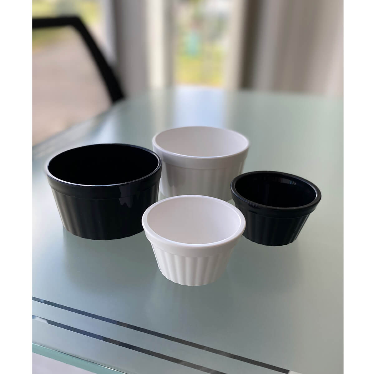 Este jogo de 20 ramekins pretos 90ml cada, da linha Uno é perfeito para surpreender no momento de servir! Com seu design sofisticado em formato circular e com a parte de fora canelada, essas pequenas tigelas são ideais para servir suflês e o famoso “Crème Brûlée”, mas podem ser utilizadas também para servir diversas outras sobremesas, aperitivos, geleias e molhos, conforme a sua imaginação pedir. Muito versáteis, estas tigelas bowls são desenvolvidas em plástico polipropileno com design clean e elegante, combinando facilmente com outros componentes sem interferir na apresentação da mesa.