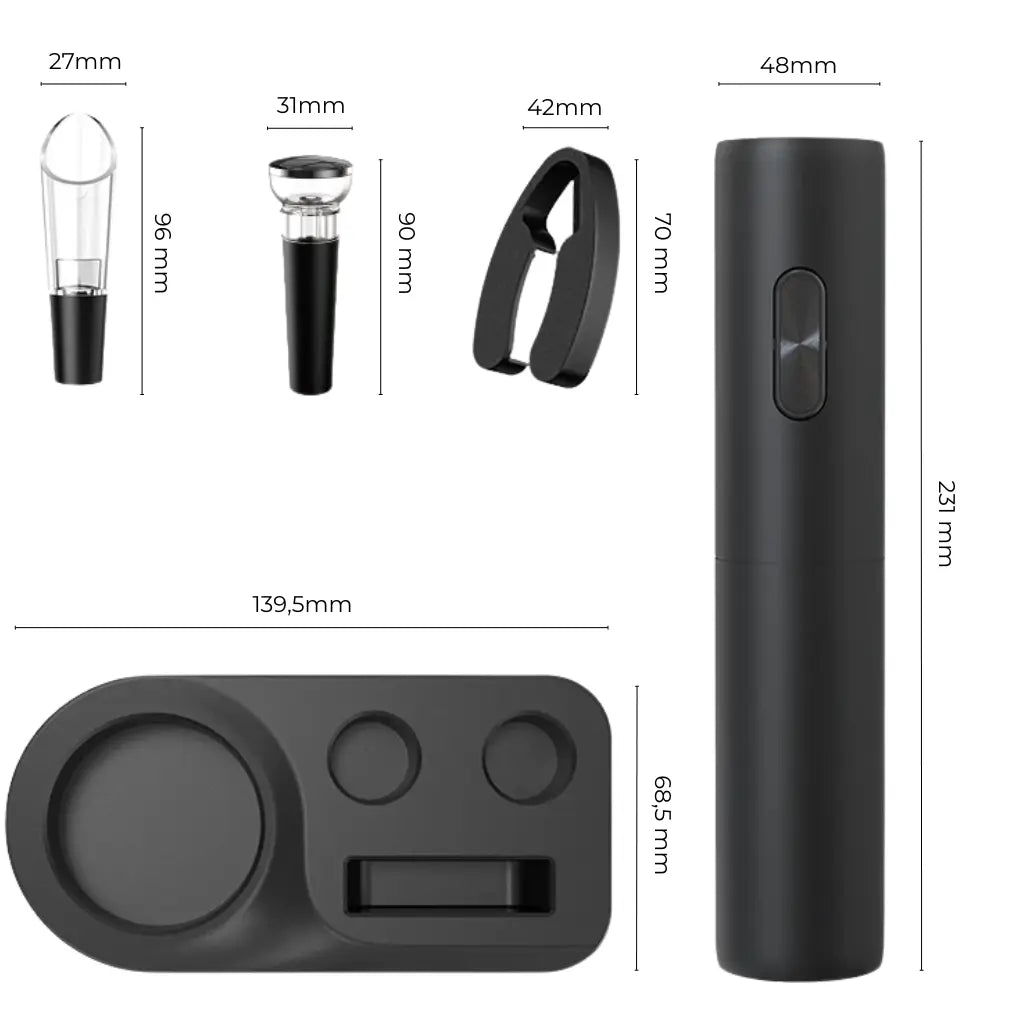 O ritual de abrir um bom vinho pode — e deve — ser tão elegante quanto a bebida que será servida. Este kit foi criado para transformar sua experiência desde o primeiro movimento: com o abridor elétrico recarregável via USB, você remove a rolha com um toque, sem esforço, sem barulho, sem comprometer o charme da ocasião. O cortador de lacres oferece precisão e segurança, enquanto o aerador instantâneo revela toda a riqueza dos aromas e sabores da bebida em segundos.