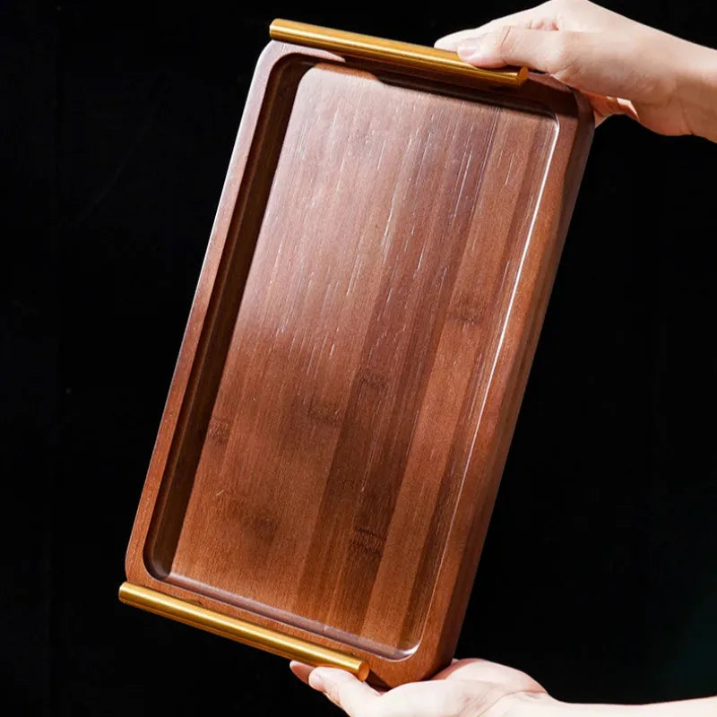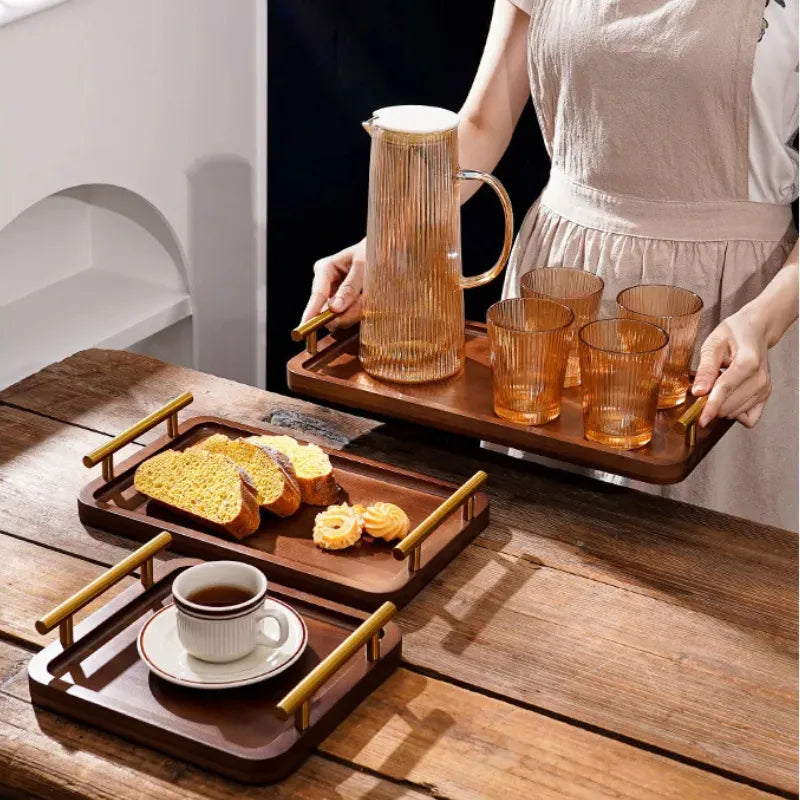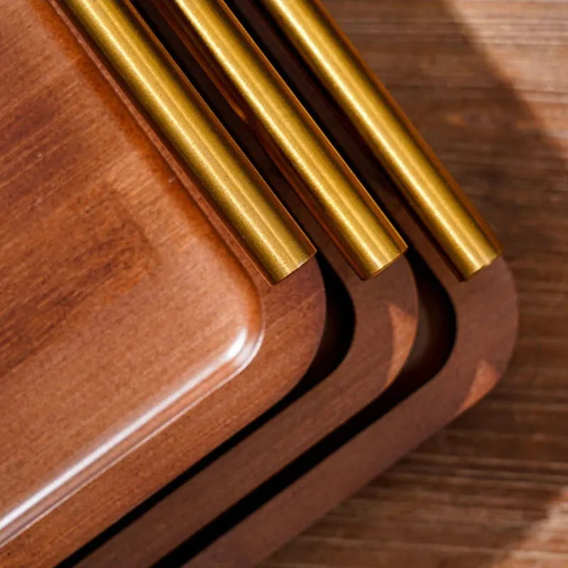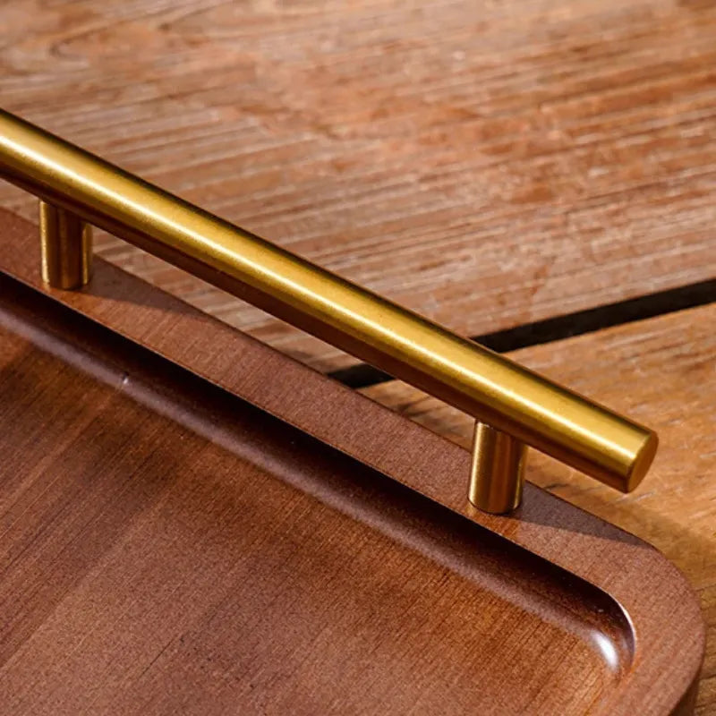 Bandeja de madeira com alça dourada une estilo, resistência e versatilidade para servir e decorar sua rotina.